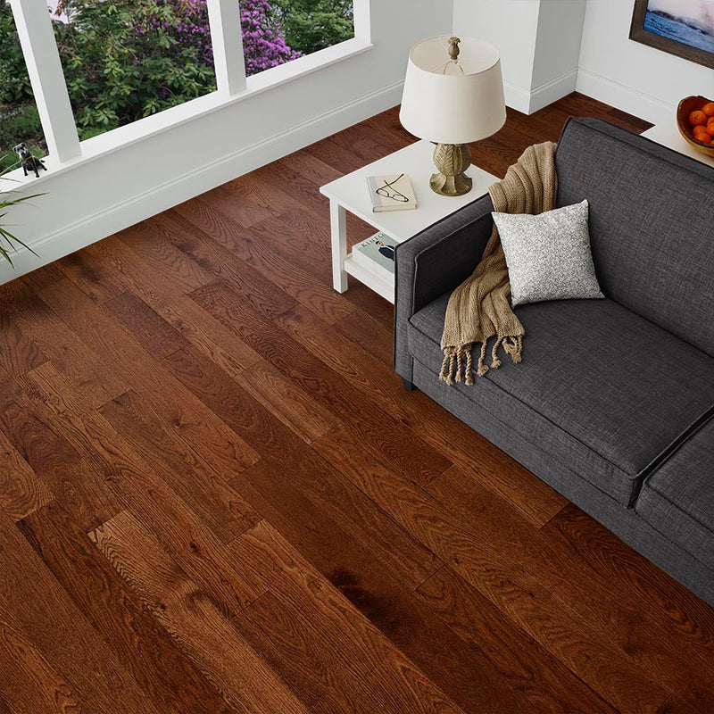 Saddle's rich tobacco tones and hints of smoky charcoal truly offers a super versatile wood flooring look. Matches will with all styles of furniture, fixtures, and design schemes.