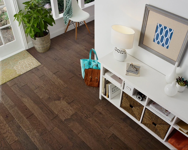 Sterling is a neutral olive-brown hand-scraped hickory wood floor. Its hints of grays make it a unique and sophisticated choice, while the olive undertones infuse a subtle earthiness. Furthermore, the shades of iron tones add a contemporary twist. The hand-scraped texture brings out the wood's character, creating a floor that's both stylish and rustic, making it an excellent choice for a modern yet warm and inviting ambiance.