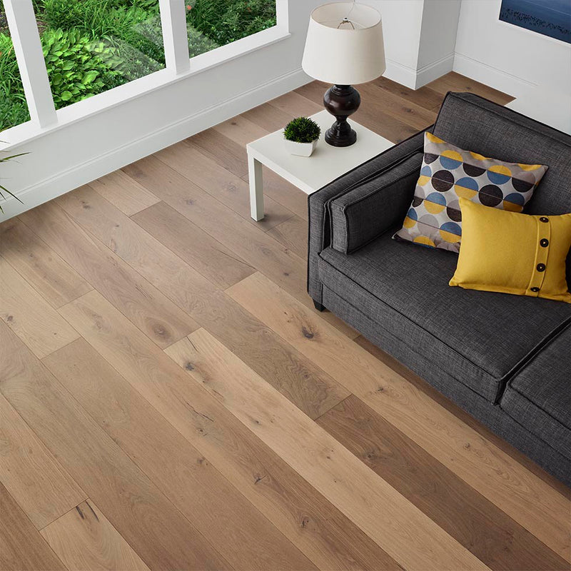 Trailhead combines warm earthy grey tones with straw and pewter accents to pair with beautiful oak grain for a simple and cozy vibe - the perfect natural colored wood floor.