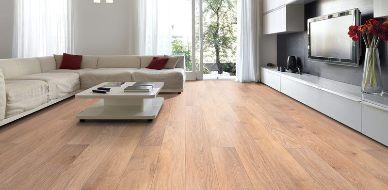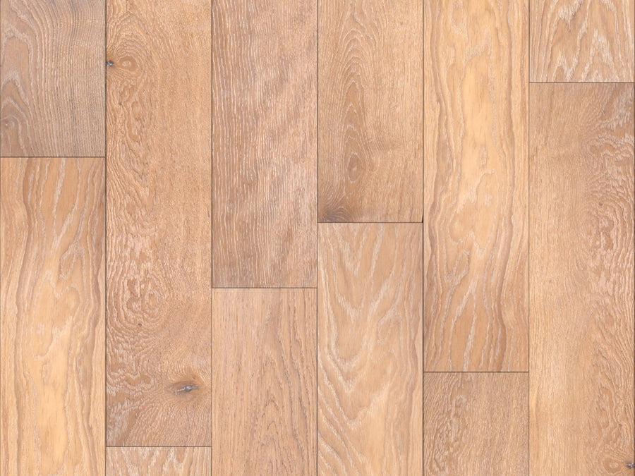 Think of peaches and cream. A light fresh pastel look, with the warmth of soft peach tones and off whites. There is a lightly wire-brushed texture and white is added in to the grain to provide an elegant floor with a gentle playful feel.